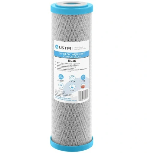 Wkład, filtr węglowy BL marki USTM w postaci bloku węglowego, charakteryzujący się niskim pyleniem w stosunku do wkładów z węglem granulowanym. Produkt wykonany jest ze spiekanego węgla aktywowanego, który posiada zdolność filtracji na poziomie do 10 mikronów.